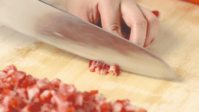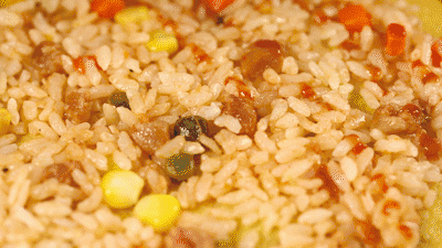 把蔬菜丁和腊肠丁放入电饭煲中,