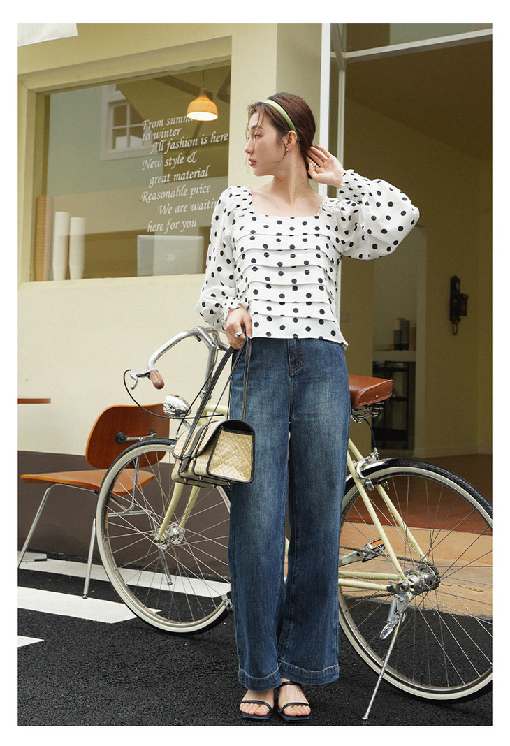 经典黑白波点印花配方领,营造了经典法式风格,大方领露肤度高,能露出锁骨更显瘦,穿出随性慵懒的法式女郎风。