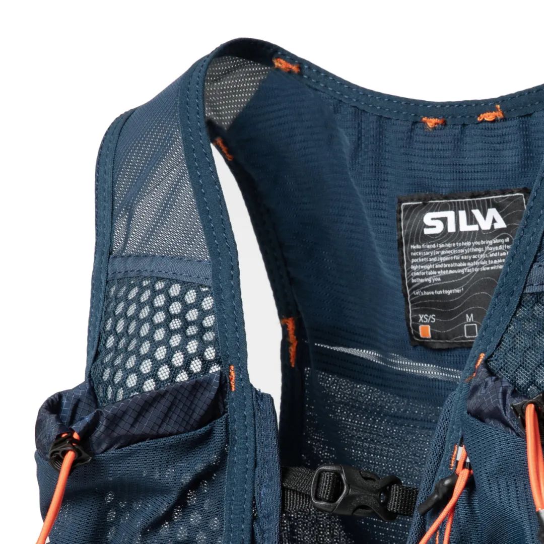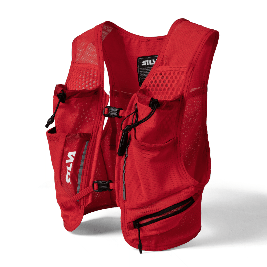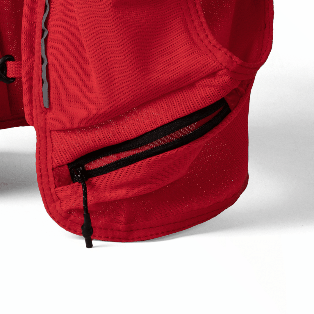 包身前侧的两个加大水壶袋,可以分别装载500毫的SILVA FLASK运动软水壶,随时补水,满足越野赛强制装备要求。