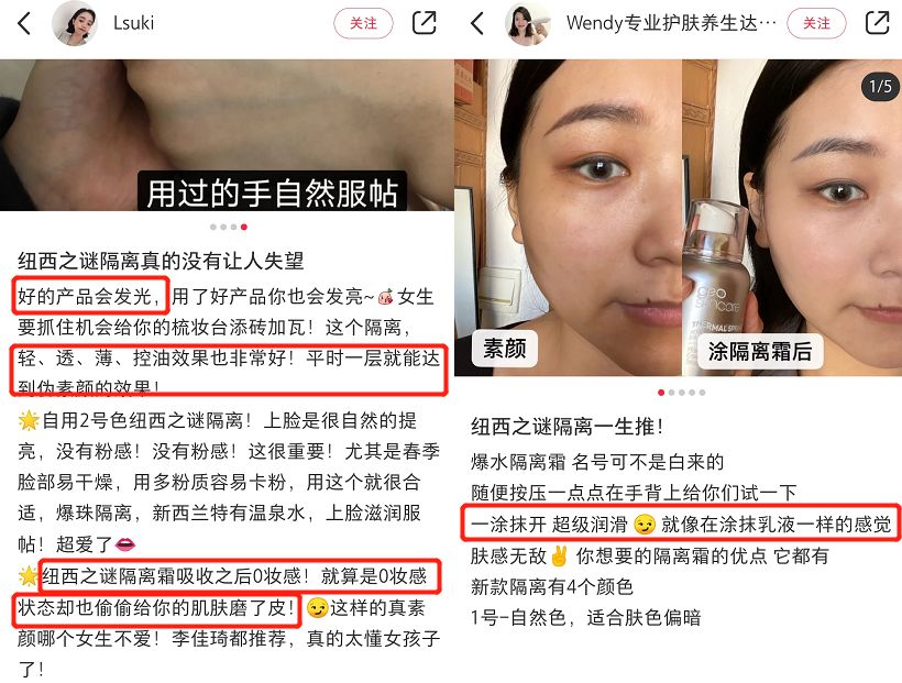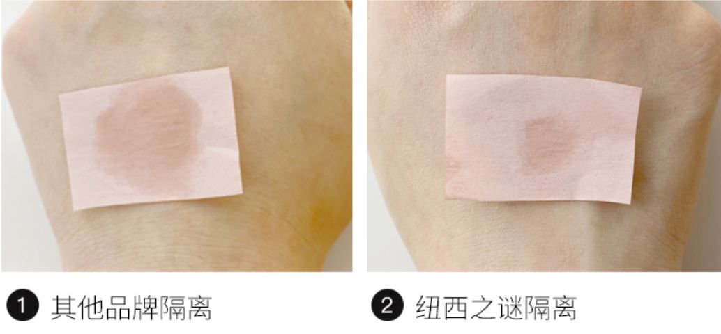 来看实验,左边先涂上纽西之谜的隔离霜再上粉底,右边直接在纸上涂上粉底。