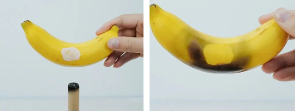 隔离有害物质:用艾条熏香蕉,有隔离的部位能把烟雾颗粒阻挡,香蕉皮不变黑,而周围的香蕉皮则变黑了。