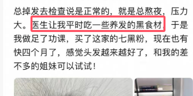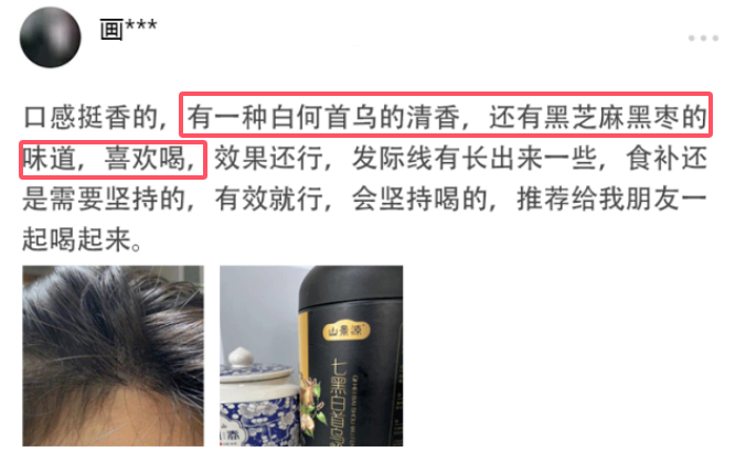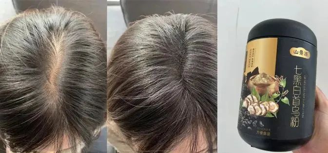 @上海姜女士:之前一抓一大把的掉头发,头頂分界线非常明显,贴心老公买了七黑白首乌粉,让我早饭前喝一碗。现如今头发养回来了,和之前判若两人,“少女感”十足!