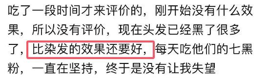 不得不提我妈妈,快60岁了,我给买了4~5次,吃了一段时间,白发掉发的情况自然好转!过年家庭聚会,一头乌黑亮丽的秀发让七大姑八大姨都羡慕坏了。纷纷找我要链接