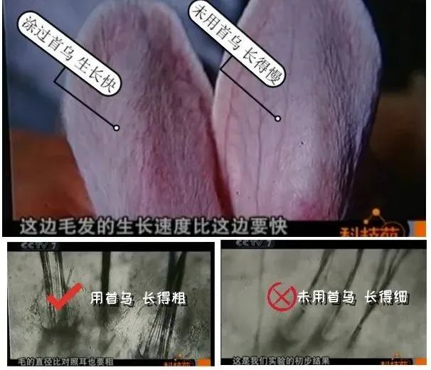为了验证,龚教授将一只兔子的耳朵剃毛,一只涂抹了何首乌提取液,一只没涂;结果涂过的毛发快速生长、而且毛发更粗、更密集。