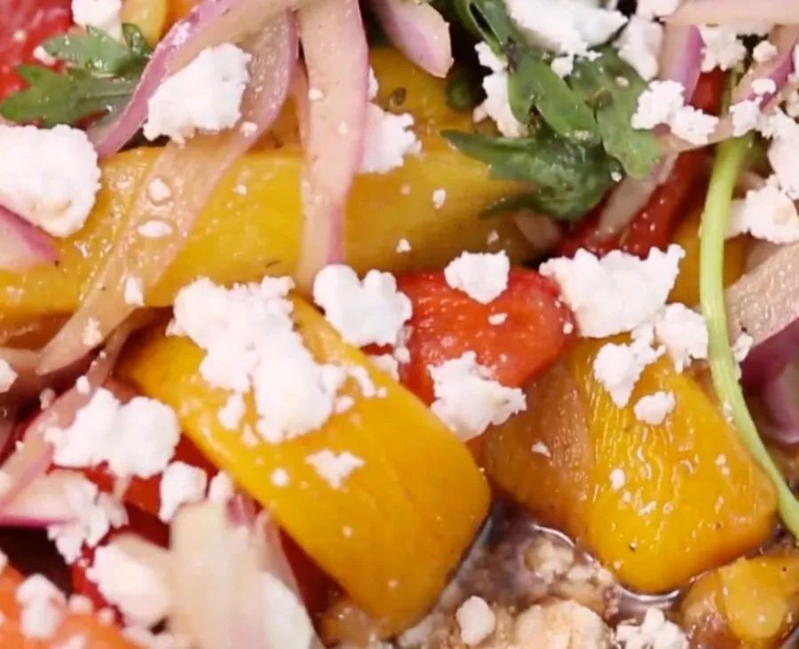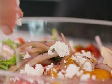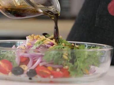 5.准备另一个大碗,加入灯笼椒,紫洋葱,火箭菜,黑橄榄,松子和圣女果,洒上黑醋酱拌匀。
