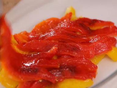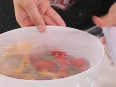 3.立即将灯笼椒取出放在大碗中,用保鲜纸包裹约20分钟,将灯笼椒发黑的表皮除去,去蒂及去籽,切条备用。