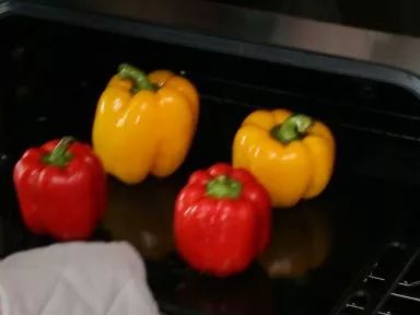 2.将灯笼椒放在烤盘上上,淋少许橄榄油,放入烤箱烤30-35分钟,直至表皮变黑。
