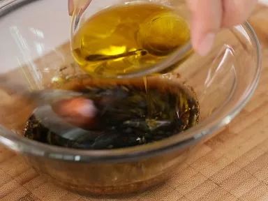 4.慢慢加入橄榄油,拌匀成乳化状的酱汁,加入盐及黑胡椒调味。