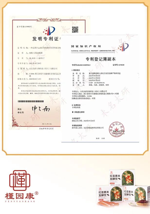槿园康有自己的发 酵酶解工厂,20余人的研发团队,4大学院深耕多年,运用发 酵粘液乳杆菌、嗜酸乳杆菌、植物乳植杆菌,3联益生菌发 酵更滋养,而且还获得了専利技术认证。