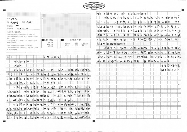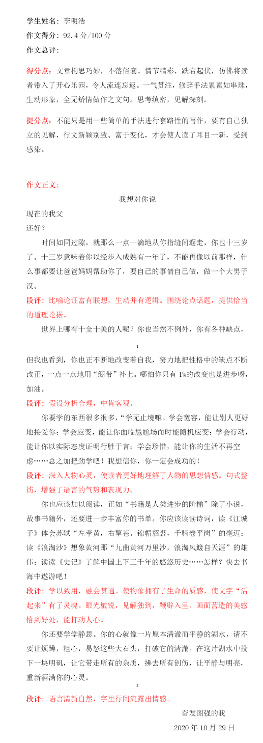 李明浩同学是个聪明、内向、腼腆的小男孩,热爱学习,热爱读书,热爱写作。希望在今后的学习生涯中一路向前,拥抱绿叶,拥抱红花,拥抱一切美的事物