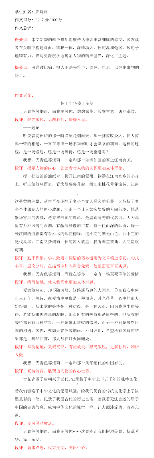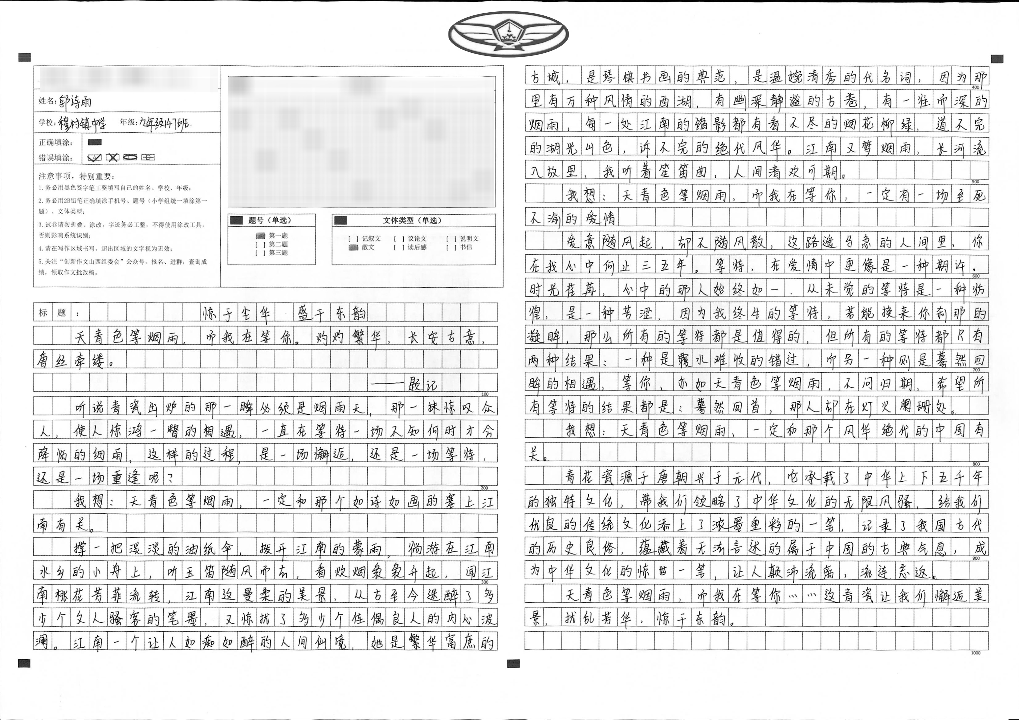 在我听到老师说出天青色等烟雨,而我在等你这个命题时,我的眼前就浮现出了烟雨江南。在我看来用天青色等烟雨,而我在等你来修饰江南再合适不过,江南独特的柔情从古至今都是一段佳话。一把油纸伞,罗素裙,淡妆素雅,执纨扇的江南女子更是让人为之沉迷。天青色等烟雨而我在等你,一个“等”字流露了所有的情感,你是人间惊鸿客,你胜过这世间的三千繁华,江南烟雨朦胧,等烟雨亦等君逢暮然回首那人却在灯火阑珊处为最好的归期。青花瓷是中国文化惊艳世人的一笔,我觉得这也是表现命题的一种,更多是希望人们能够传承中华文化中华民族历史悠久。青花瓷是素雅与艳丽的和谐统一,它犹如牡丹,叶青花红,雍容华贵,国色天香,它的色调比重具有广泛的可变性,或浓汝淡抹,或写实写意,都意境深远,巧夺天工,这样优秀的文化应该传承下去。