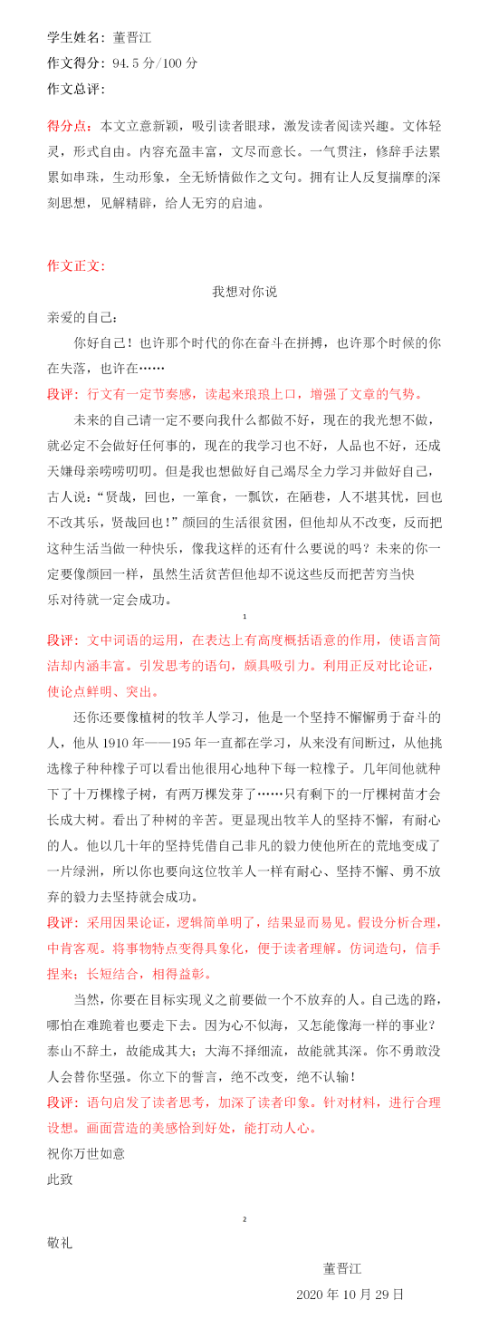 “泰山不辞抔土,故能成其大;大海不择细流,故能就其深。”愿董晋江同学在文学创作的道路上,能不辞抔土、不择细流,一步一个脚印地积淀起深厚的文化底蕴,终成“山”“海”能大放异彩!