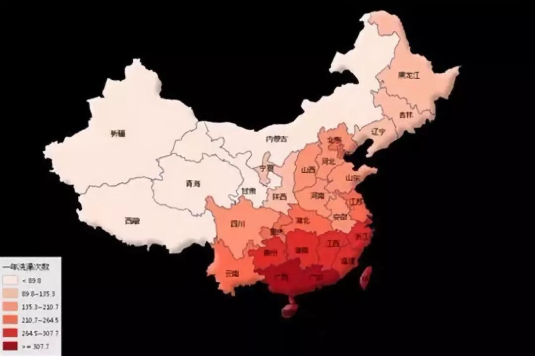 ▲中国各省一年洗澡次数分布