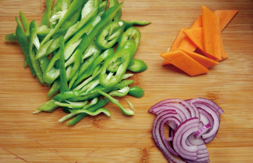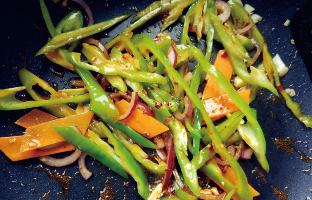 2、锅里留底油,把切好的青椒丝、洋葱圈、胡萝卜片下锅炒香;