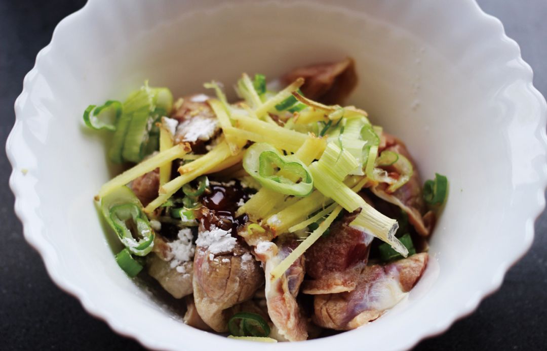 3、把改好刀的鸡胗放入盆里,加入洋葱1两(丝或块都可以),姜2片,花椒面3~4克,酱油2勺,2指1捏白糖,2勺料酒;