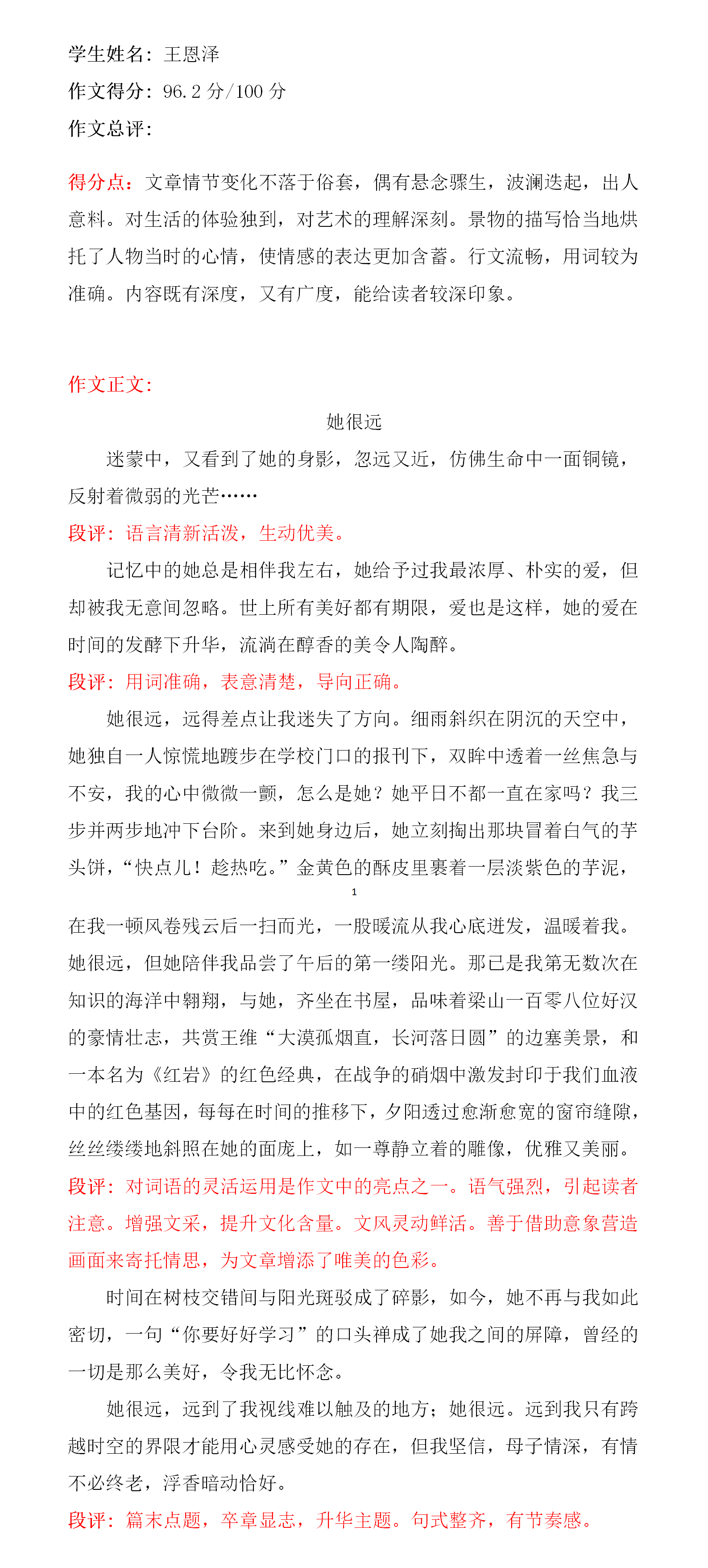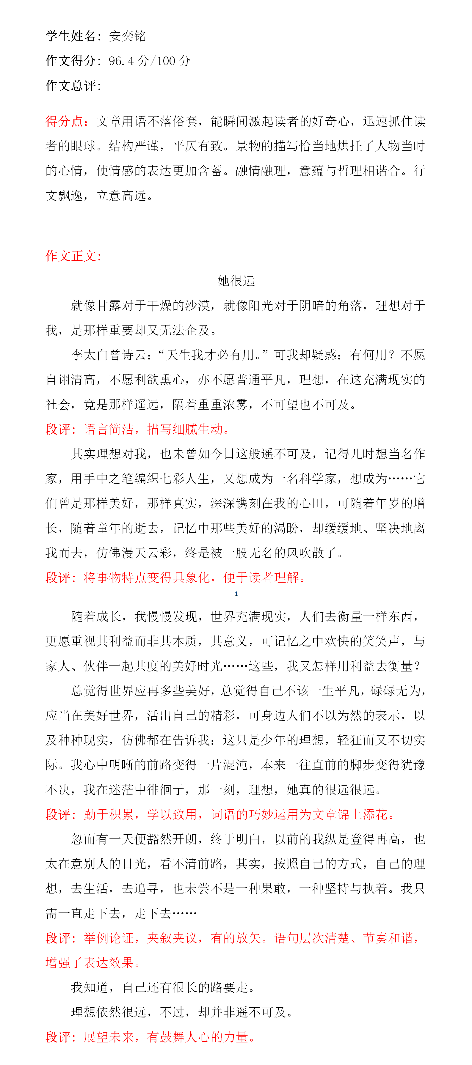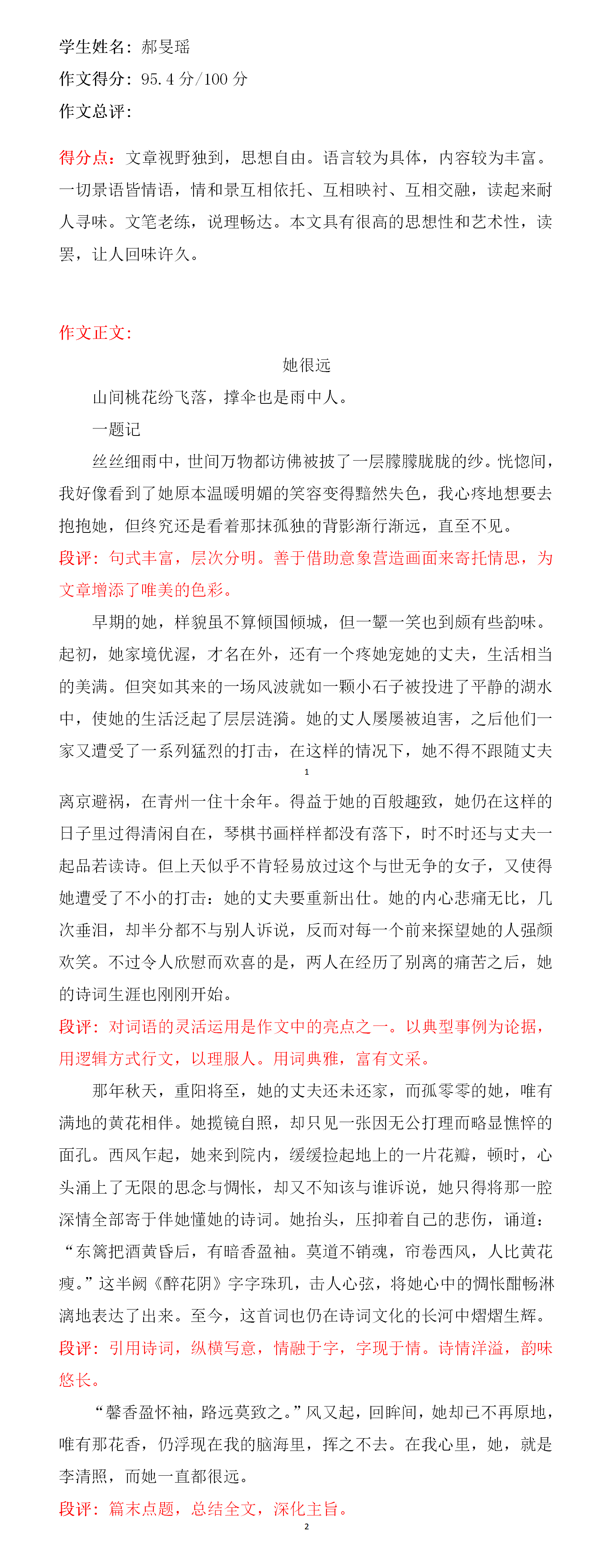 “业精于勤荒于嬉”,勤能补拙。孩子从小喜爱阅读,善于思考,学以致用,这为她的写作打下了坚实的基础。《她很远》这篇文章,意境深远,情景交融,尤如一幅美丽的图画展现在眼前。文笔优美尚且不谈,对于历史人物李清照女词人的生平也了然于胸,这是需要大量阅读,日积月累而成的。成功没有捷径,更离不开老师与家长的精心栽培。巴斯德有句名言“告诉你使我达到目标的奥秘吧,我唯一的力量就是我的坚持精神。”坚持是灵魂,坚持是希望,望孩子戒骄戒躁,继续努力,在今后写作的道路上有所建树!
