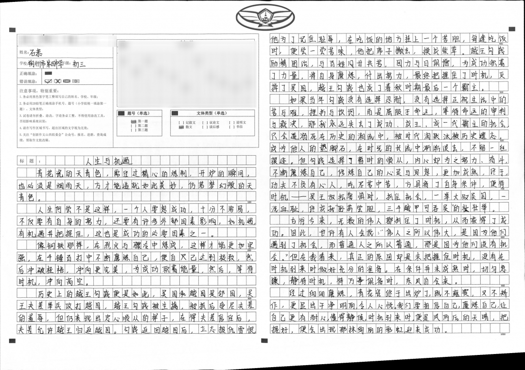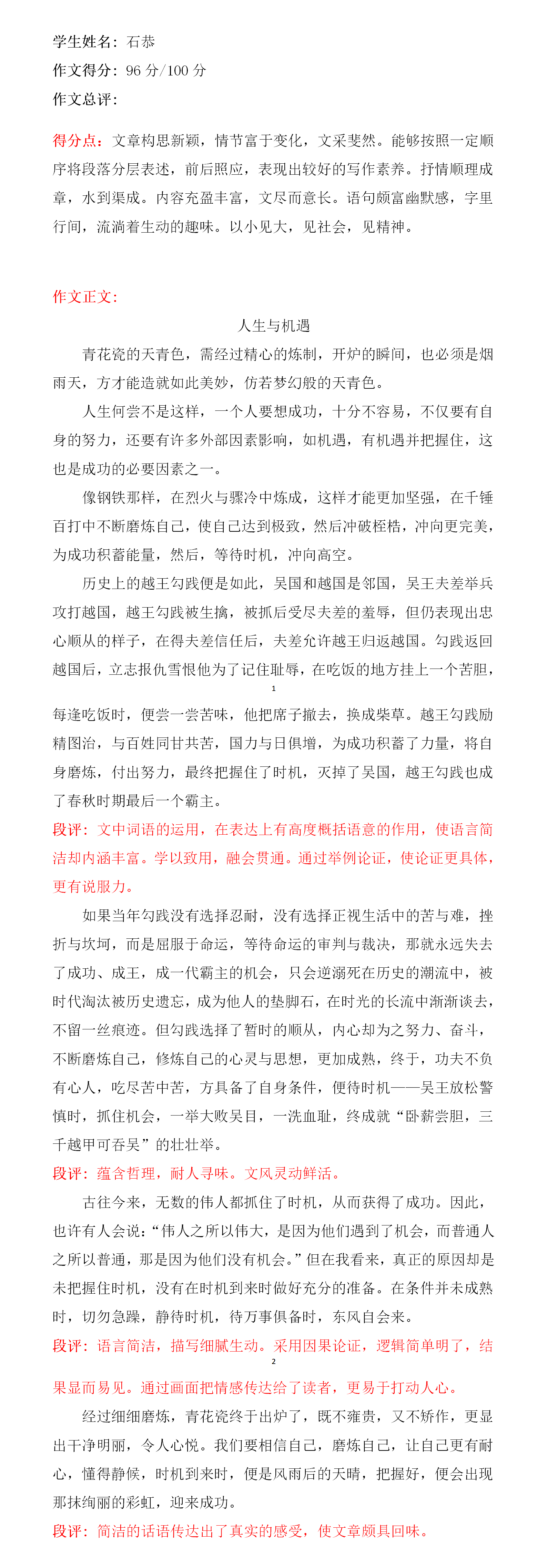 从泥水中脱胎,在烈火中升华,于烟雨中华丽蜕变。这是“雨过天青”的传奇人生,又何尝不是每一种成功所必经的历程呢?石恭同学的《人生与机遇》读懂了青花瓷,也读出了自己对人生的思考:成功需要努力,也需要机遇。经过千锤百炼的锻造,才能抓住机遇,赢得成功。文中以越王勾践的故事充分的证明了这一点。勾践卧薪尝胆,励精图治,用二十一年的时间终于雪耻复国,怎一个“等”字了得!作者认为,正是因为勾践在苦难中不断强大自己,才能抓住机遇成就霸业,迎来属于自己的雨过天晴。磨难历练人生,而机遇成就人生。一篇文章有了思想才有灵魂,对于初中生来说,能有这样的感悟十分可贵。这得益于该同学平时热爱读书、勤于思考的阅读习惯。较好的语文素养使她写作时能够信手拈来却不失理性,朴实自然又总闪现着思想的光彩,使她的文章有了中学生该有的广度和深度。在今后的学习和写作中,希望更加广泛涉猎,厚积薄发。如英国历史学家托福勒说的:“一个明智的人总是抓住机遇,并把它变成美好的未来”。