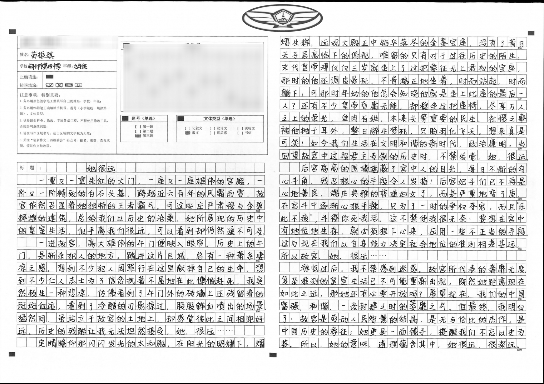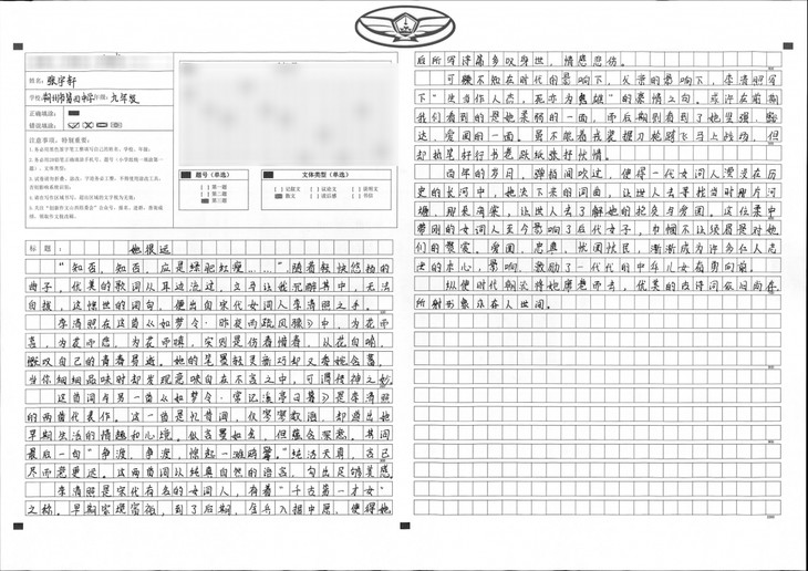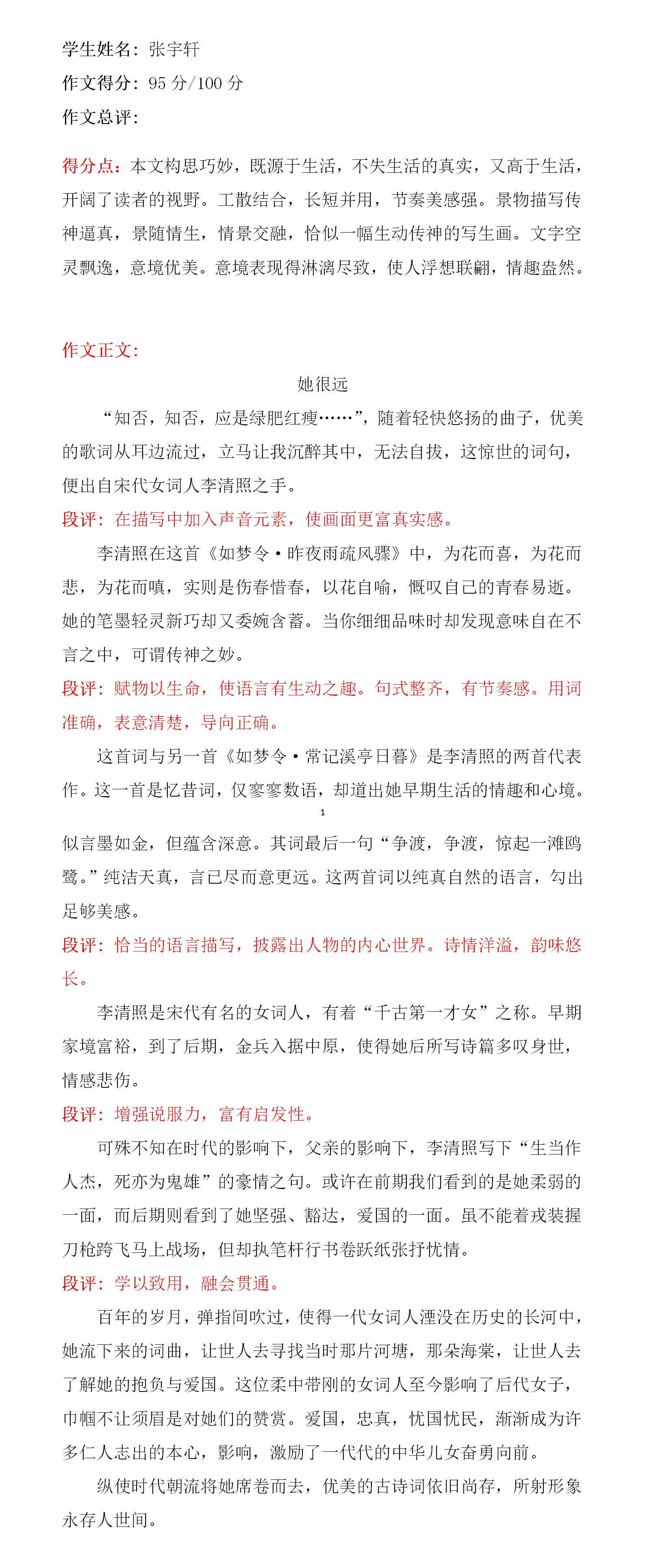 “诗中有画,画中有诗”。张宇轩同学平时喜欢诗词歌赋,班中的课外古典文学阅读一直都是她积极领读,坚持三年,如今这篇文章的优秀便是她平时丰富积累的再现。文章选材新颖,思想独到。以赏析宋代女词人李清照的诗词开篇,富于意境美,让人不觉陶醉其中,语言灵动活泼,句式工散结合,节奏感极强,内容充实,情感真挚,结尾深化主旨,余音袅袅,回味无穷,是一篇极其优秀的文章。