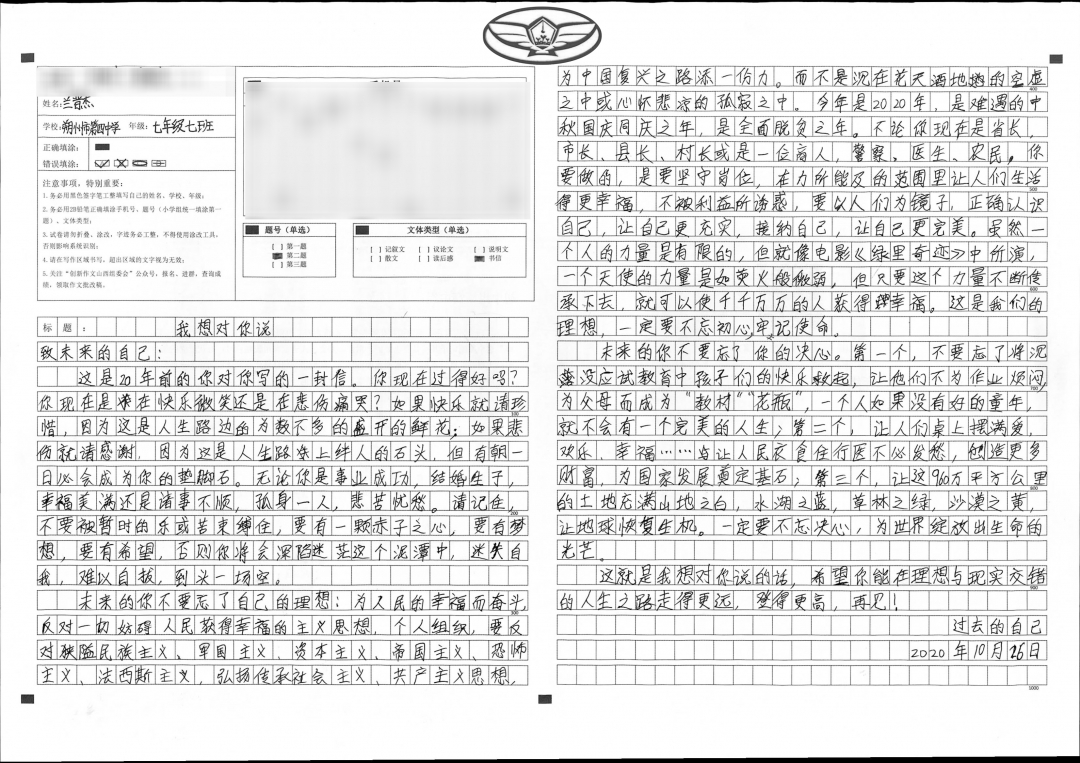 我对孩子的教育以积极引导为主,平时写作时也多鼓励孩子写出自己的感悟。从小学开始的看图写话寥寥几笔,到现在洋洋洒洒文章,孩子一直在进步成长。上了初中以后,在老师的指导下,作文的思维有了更大幅度的提高,立意更加深远有意境,希望孩子以后继续努力更上一层楼。