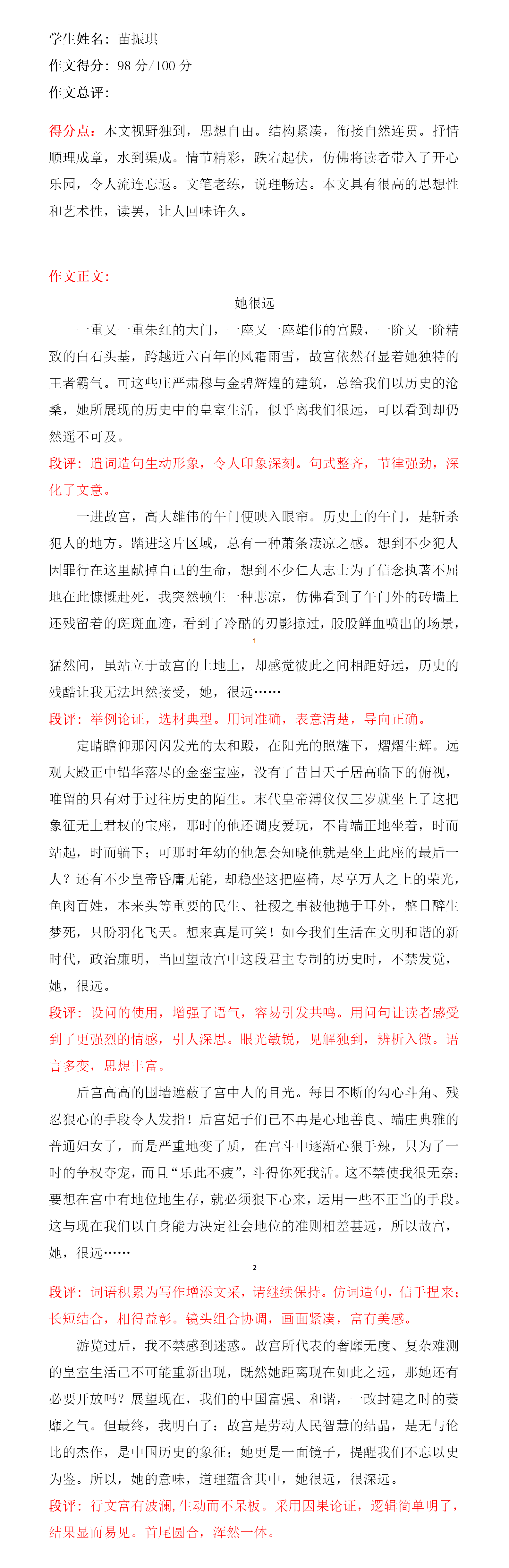苗振琪同学刻苦求真,志存高远!初入学时下笔很紧张,不够灵活。但是她善于思考,领悟能力较强。我经常与她就字词的运用,立意,格局的谋划等做一些探讨。她总能及时地将老师的点拨运用到写作实践中。要想写好文章,必须扎根于生活,眼界,胸怀开阔,善于思辩,勇于表达!本篇作文就很好的反映了苗振琪在这方面取得的进步!“路漫漫其修远兮”,文字的魅力正如同生活一般,永远值得着我们去探寻,去品味!愿每一位同学都能喜欢写作,热爱生活!