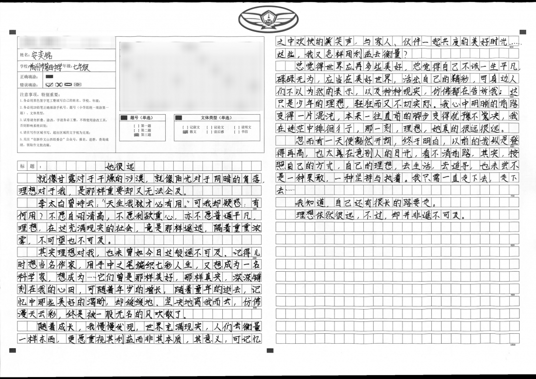 当看到题目《她很远》,看到作文“结合社会实际”的要求时,我首先想到了“理想”。在现实生活中,很多人浑浑噩噩一辈子却不知道自己真正的理想,只是顺着潮流的价值观被迫选择“理想”,我以此为基础,整合文章语言、结构加以润色,将一个少年因选择理想而迷惘、困惑,又豁然开朗的心理过程展现出来,写成了这篇文章。
