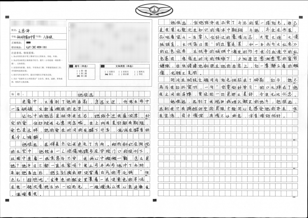 当我看到《她很远》这个题时,“她”带给我的第一感觉就是母亲,于是我用母亲以前对我的关心事件和她现在对我的态度来进行对比,突出我和她在心灵上的疏远,然后再稍加一些修改,写出了这篇文章。