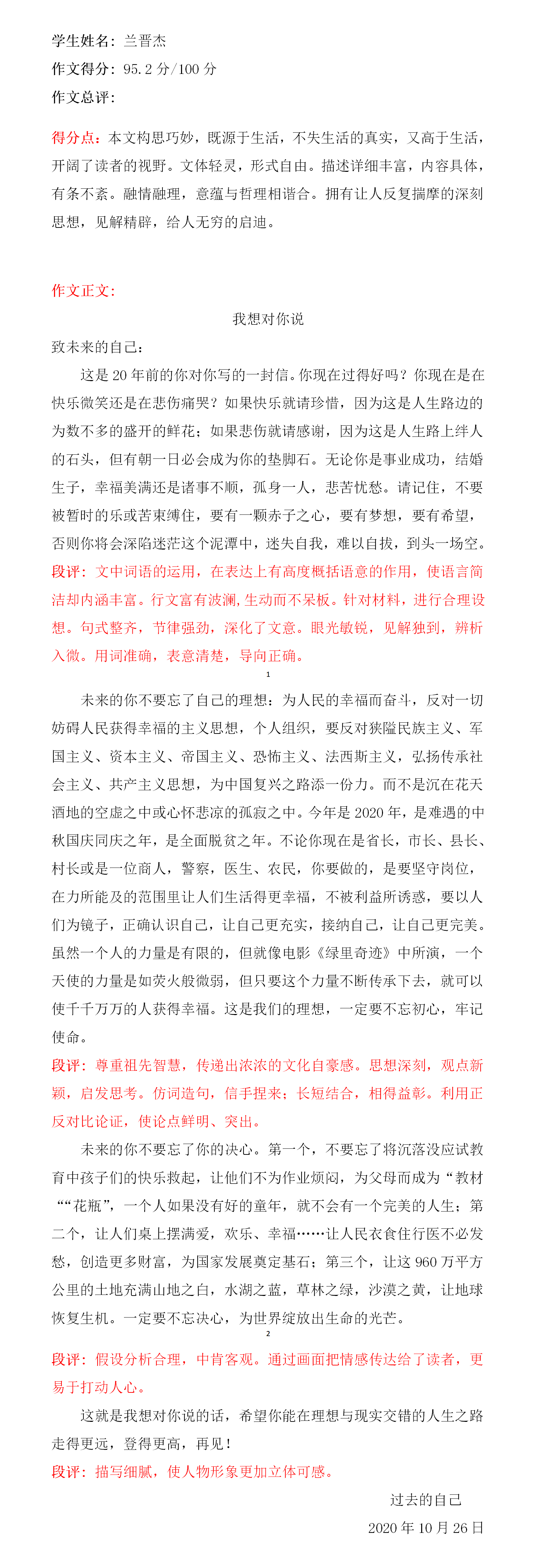 这是一篇上乘之作。首先:语言美。“石韫玉而山辉,水怀珠而川媚。”文中优美的文辞,为文章增色不少。贴切的动词,形象的修辞,精简的短语,意到笔随,一气呵成。其次,构思巧,脉络明。首段如师长般提出要有梦想、希望,接着分别以两段“你不要忘了”开头,进一步告诫自已要牢记使命,使得文章首尾呼应。