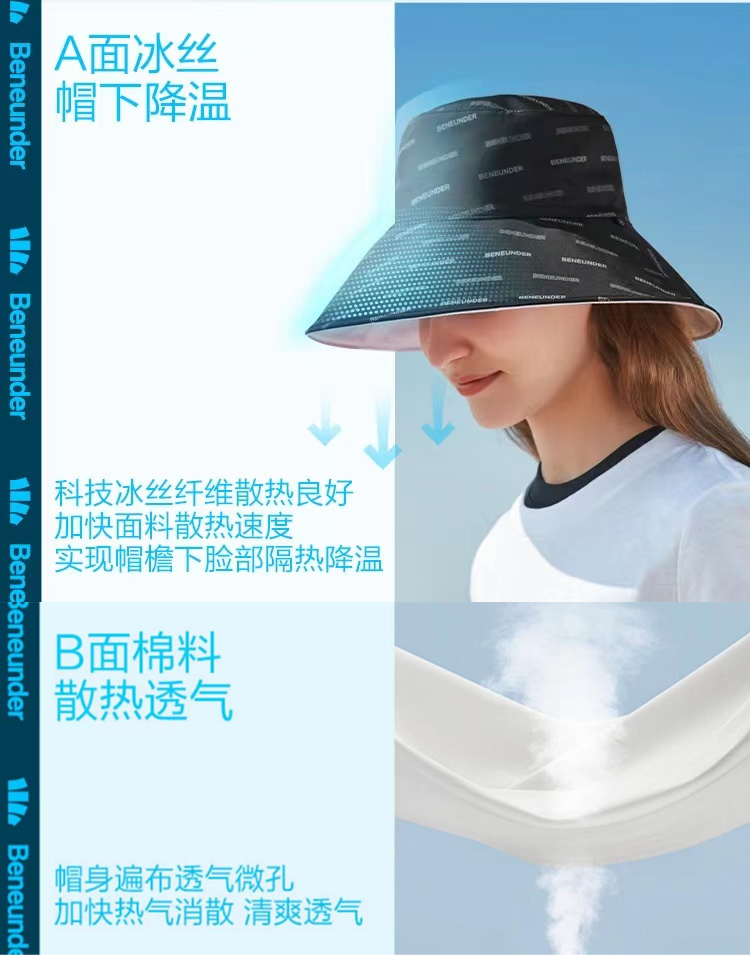 A面是冰丝材质,冰凉顺滑;B面是纯棉面料,可以说是一面冰感降温,一面透气降温。所以带着完全不会觉得闷热,真的是一点负担都没有,曾经有一些防晒帽,带没多久,我就一头汗了,这款真的是非常透气