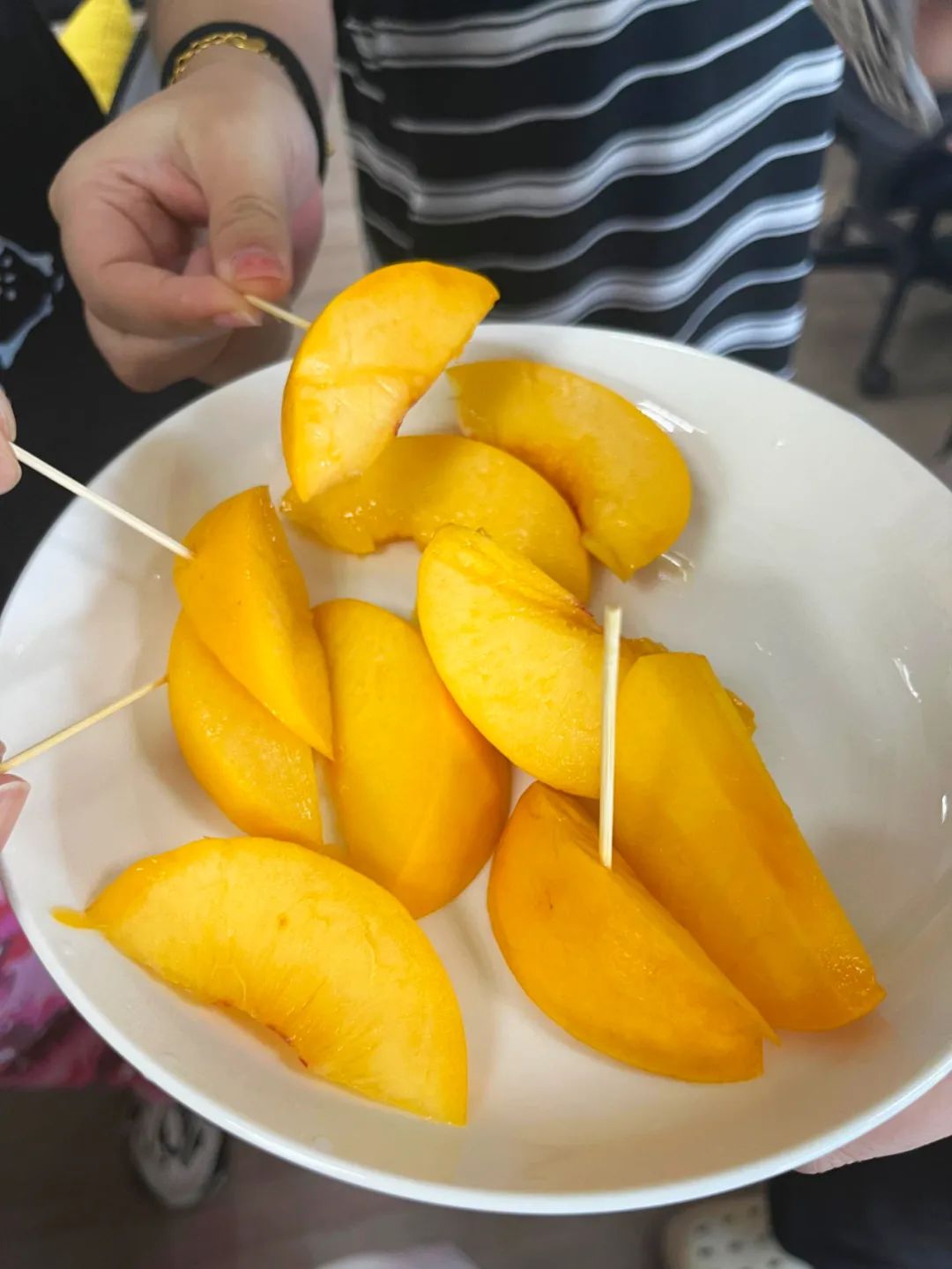 这时候的香气和甜度都会翻倍,用手戳一下桃子,表面会微微凹进去,