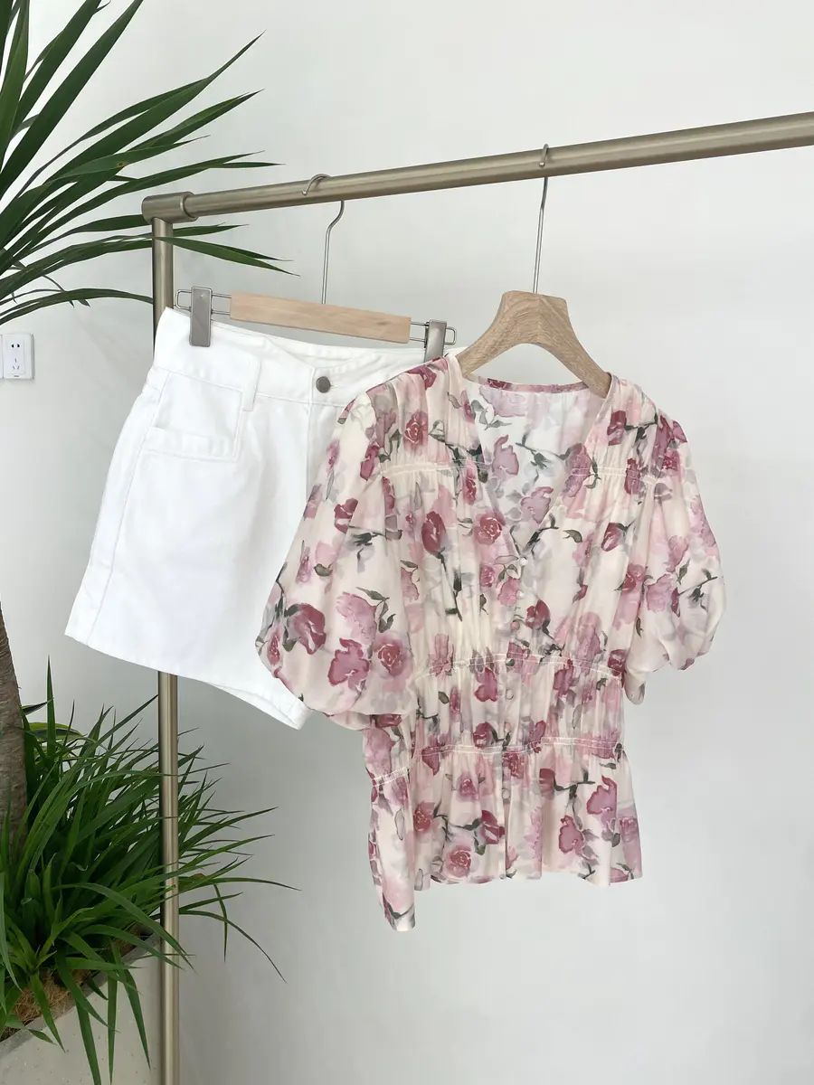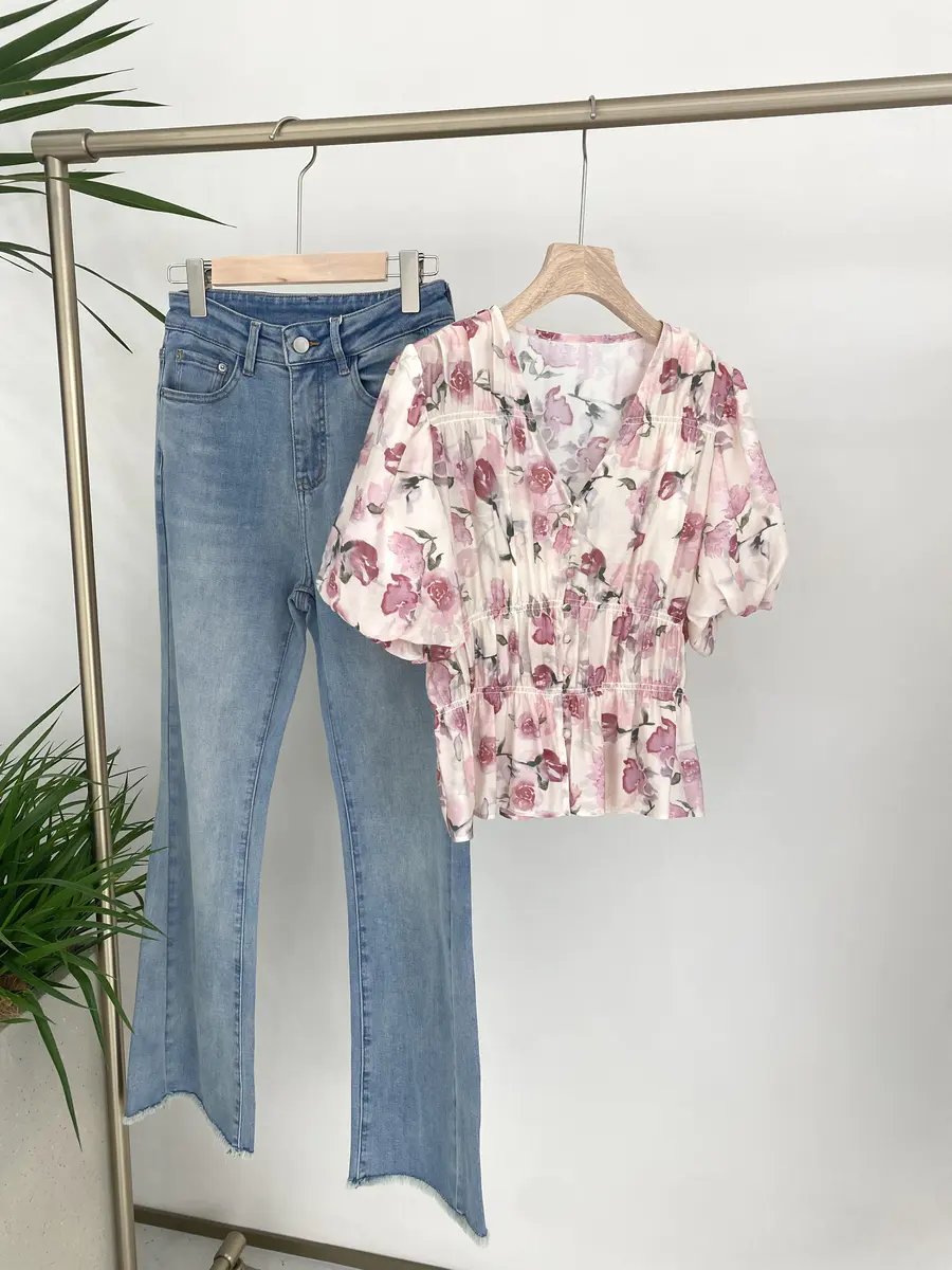 小衫整体版型属于有量感的,所以下半身建议搭配比较修身的裤装穿着,比如浅蓝色系的牛仔喇叭裤,或者白色系的牛仔短裤都非常合适,会衬的人比较纤细感~
