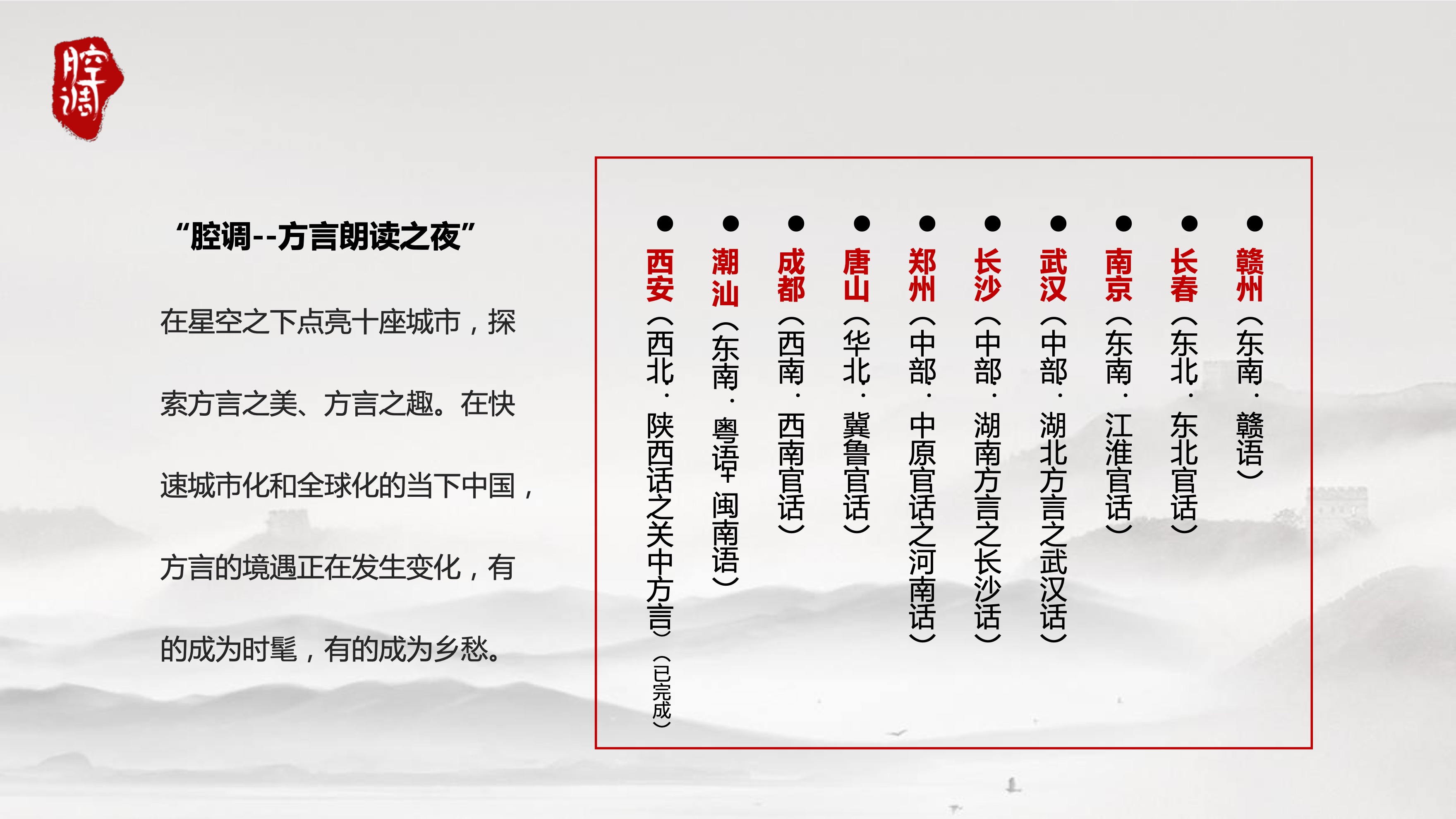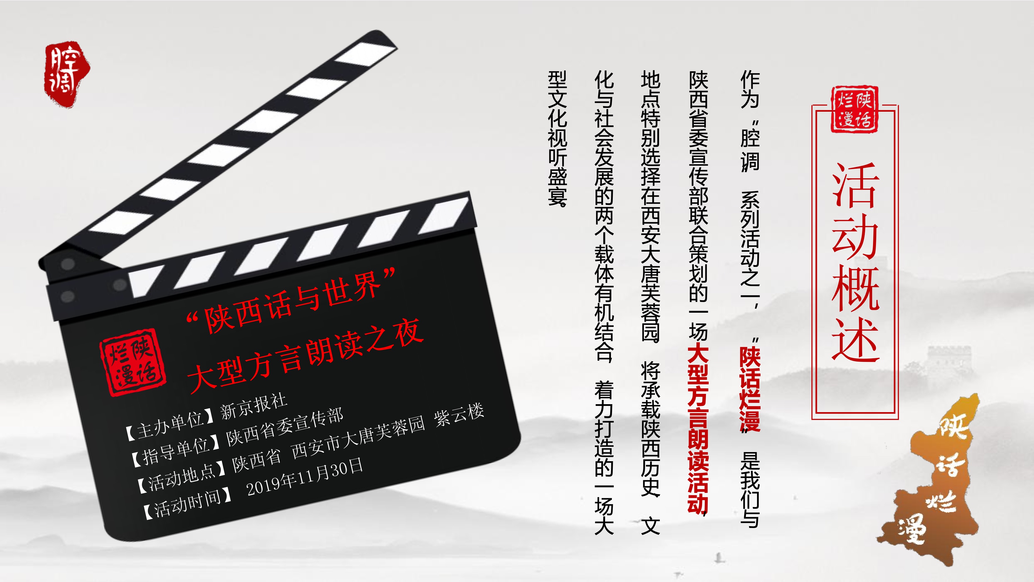 作为“腔调”系列活动之一,“陕话烂漫”是我们与 陕西省委宣传部联合策划的一场大型方言朗读活动, 地点特别选择在西安大唐芙蓉,将承载陕西历史、文化与社会发展的两个载体有机结合,着力打造的一场大型文化视听盛宴
