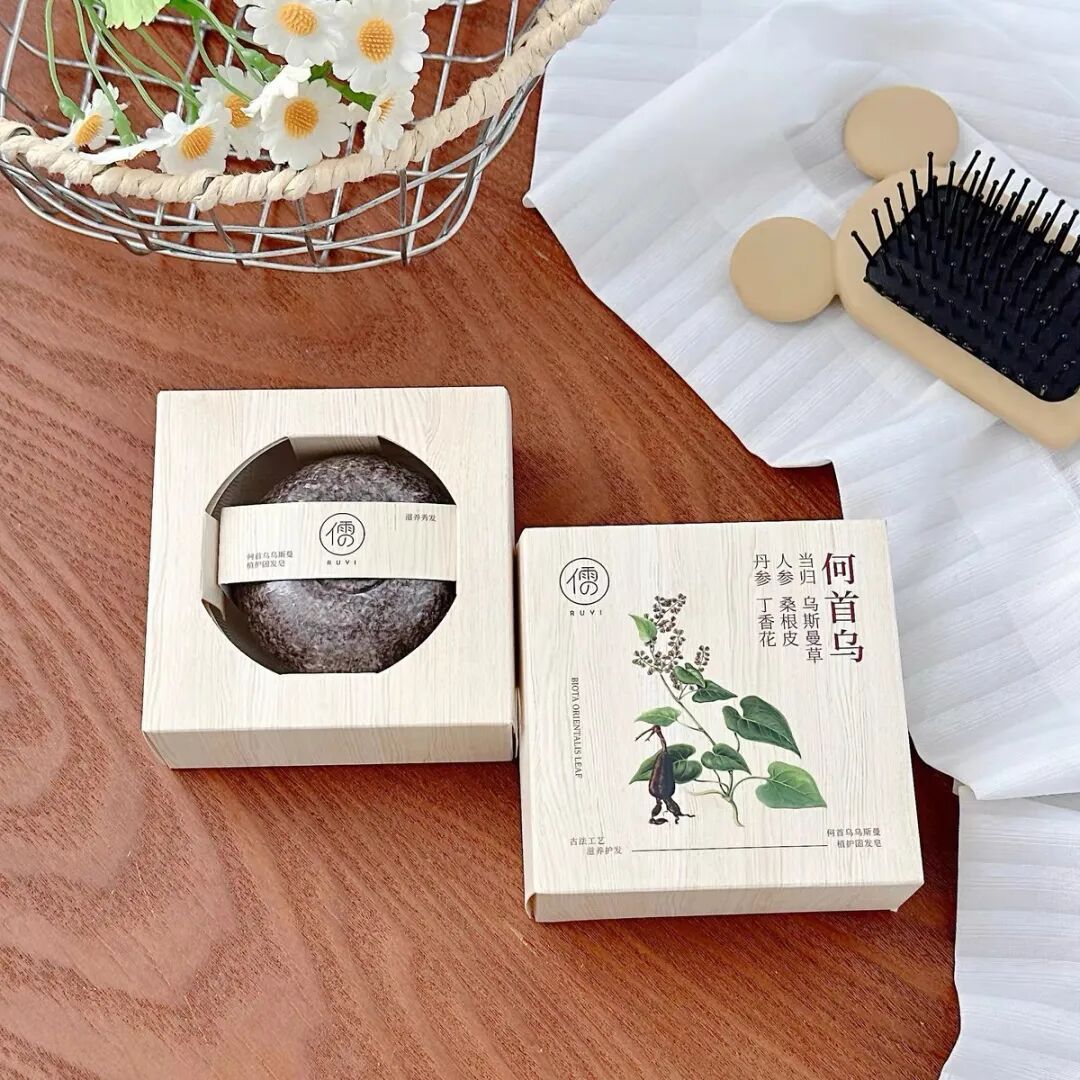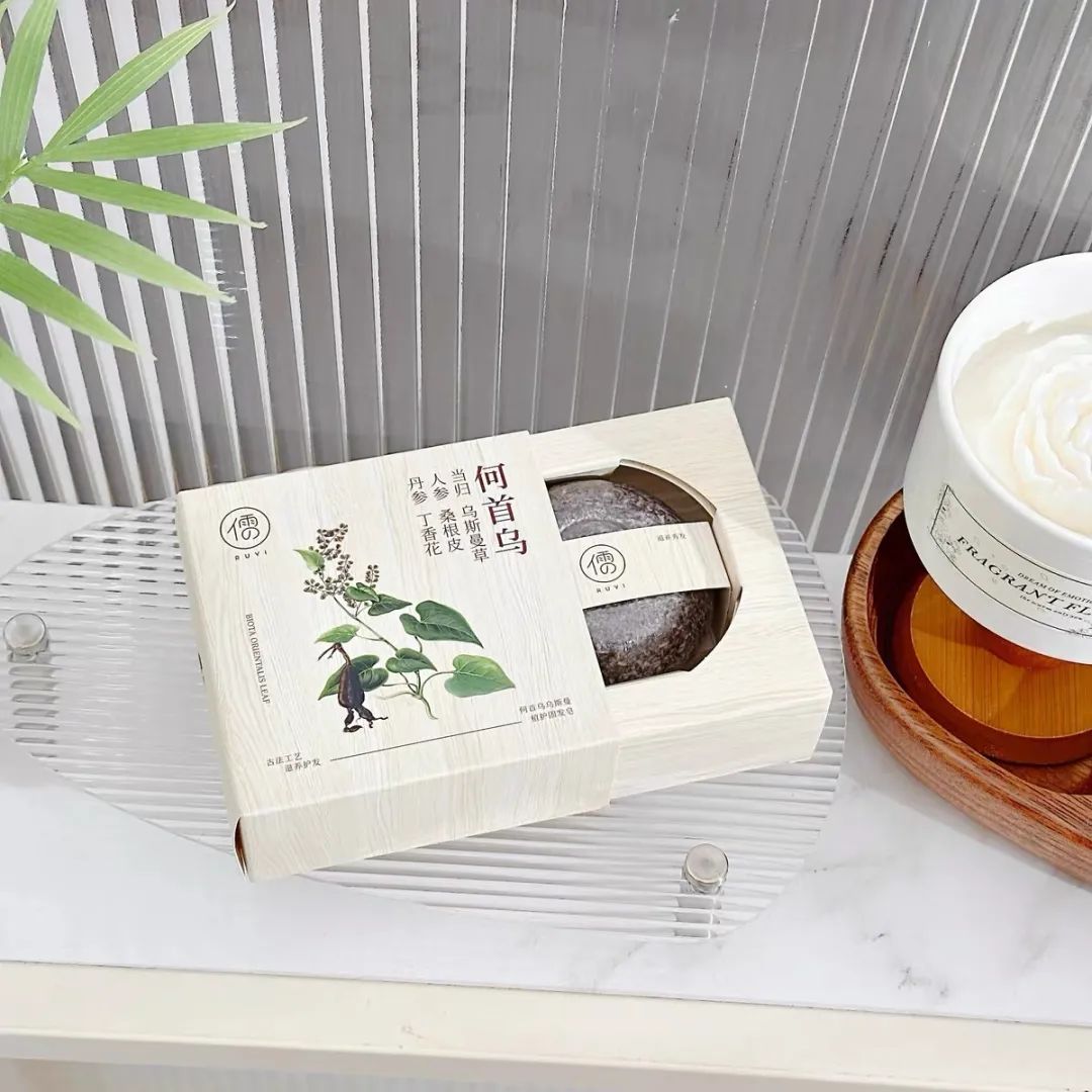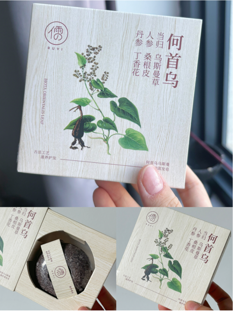 但只有单一成分可能功能没那么全,所以儒意便根据乌斯曼草作为基础,加上何首乌/侧柏叶等植物成分,研发出了这一款--乌斯曼草侧柏叶洗头皂