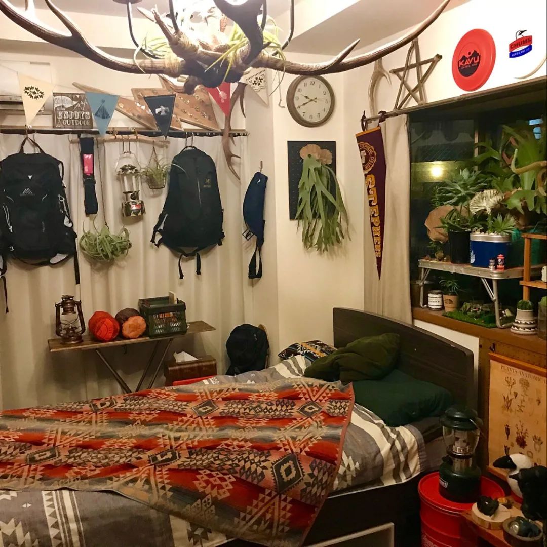 户外装备和原木灯饰一起,也可以打造一个户外风格的卧室: