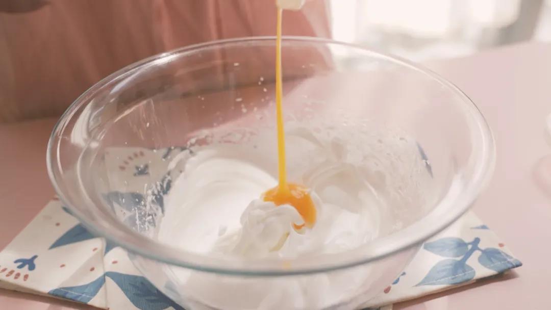 [1]分离蛋清蛋黄,蛋清加入细砂糖打发至有干性发泡状态,加入蛋黄继续搅打均匀。