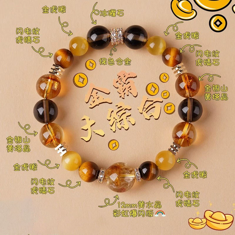 金霸大综合:由冰曜石、金虎眼、闪电纹虎睛石、金银山黄塔晶、12MM黄水晶彩虹爆闪版组成。