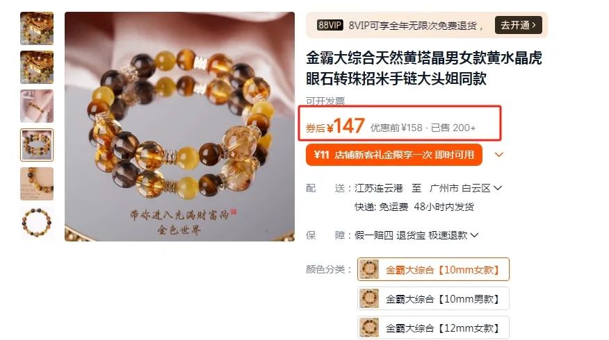 至于价格,像“金霸大综合”这样的招财水晶手链,平时活动价都要147一串: