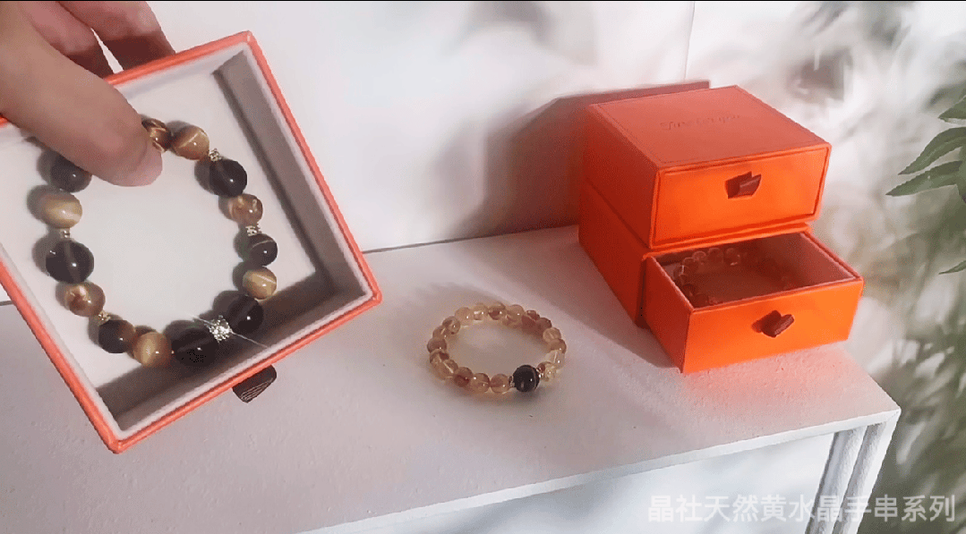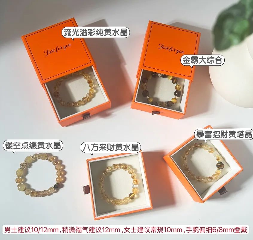 根据五行能量,精心定制了五款招财黄水晶手串: