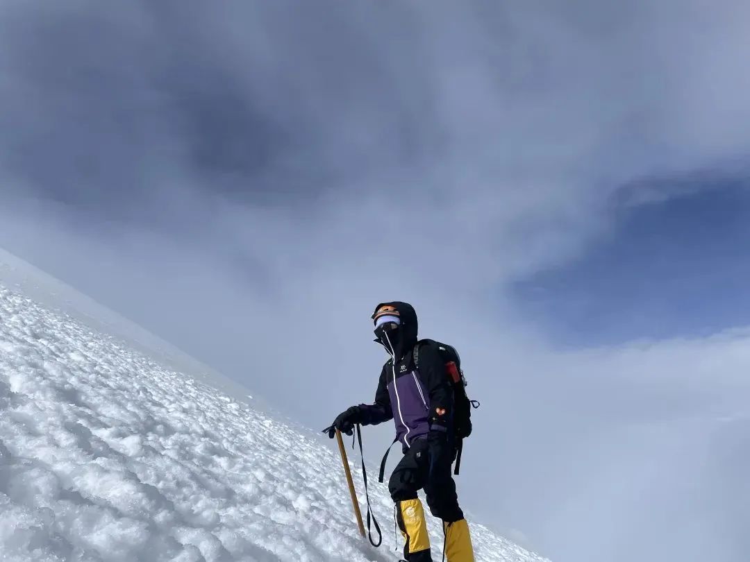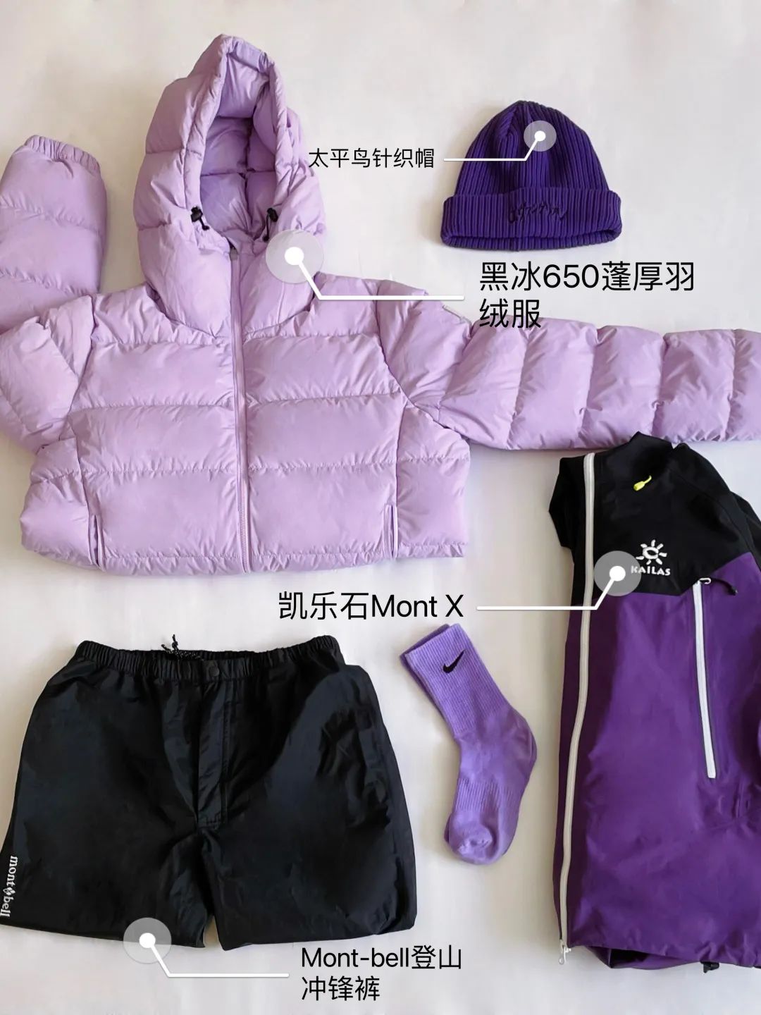 这个葡萄紫色系我可太喜欢了,黑冰这件羽绒服保暖力和颜值都足够,FP600+,M码充绒量 150g+、Mont-bell 冲锋裤防水性和版型非常棒、凯乐石的 Mont X 十分硬核,以上这个套装完美抗住了冲顶中的低温和风雨雪雾,甚至全程连雨衣都没有掏出来。