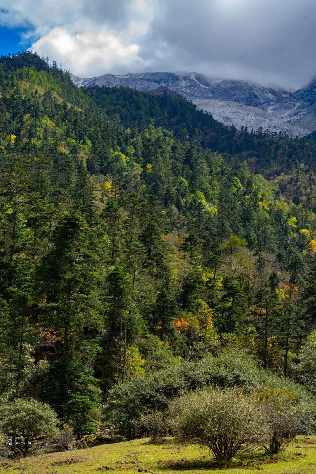 初秋攀上枝头,树叶将红未红,彩林斑斑点点,雪水融化成淙淙溪流,自然景观带丰富、垂直而又立体。哈巴雪山因巨大的海拔高低差异,形成了明显的高山垂直气候,立体分布着高山寒冻植被带、高山草甸和高山灌木丛、冷杉、云杉、针杉、山地常绿阔叶林带、干热河谷灌草丛带等,植被生态非常多样。