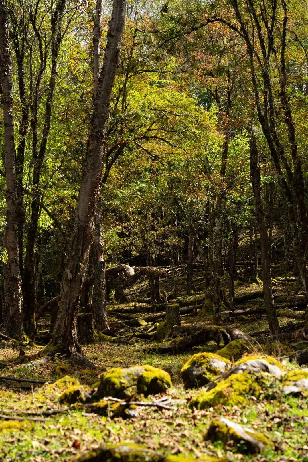 当我们行至原始森林之中,阳光越过枝头同早熟的枫叶散落一地,温和又不张扬,我觉得自己像走进了一片梦幻般的迷彩森林。
