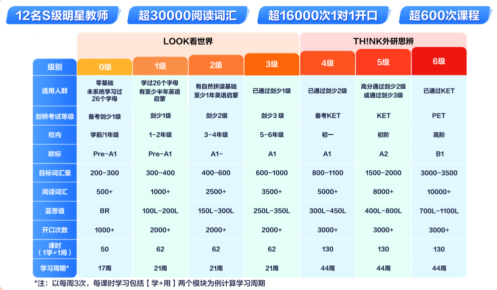 新东方AI1对1S体系原版营,由新东方重金投入,Look看世界英语+TH!NK外研思辨英语,两套官方版权合作的"双拼模式” ,低段采用Look看世界英语,坡度还好入门;高段采用TH!NK外研思辨英语 ,难度有进阶,剑桥KP考试对口,形成完整的0-6级七级体系,从零基础直达PET(高中水平),听说读写全方位综合提升。