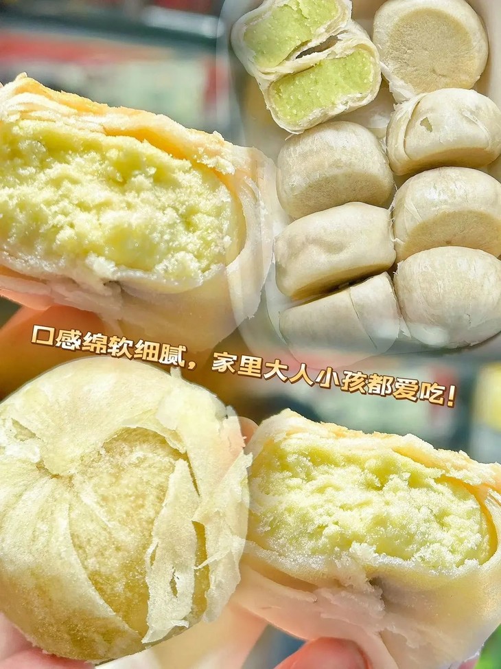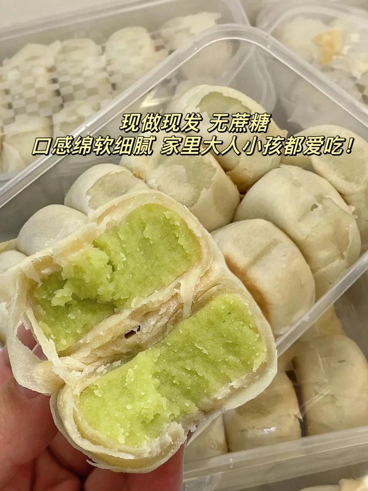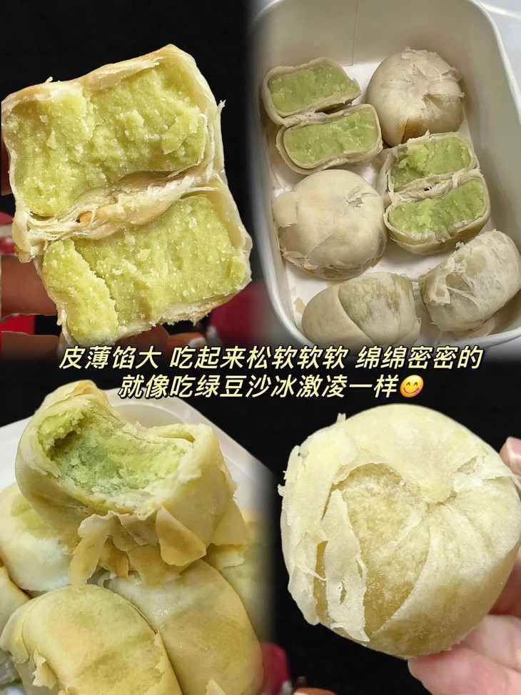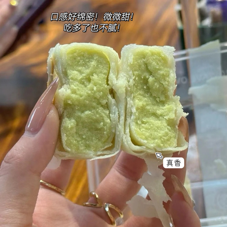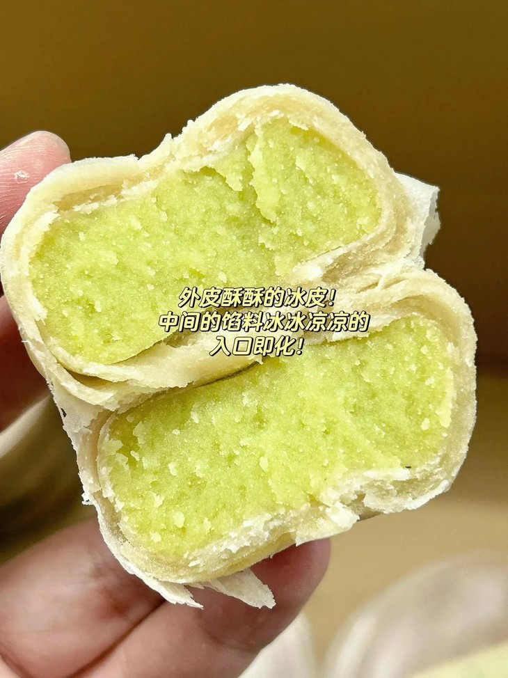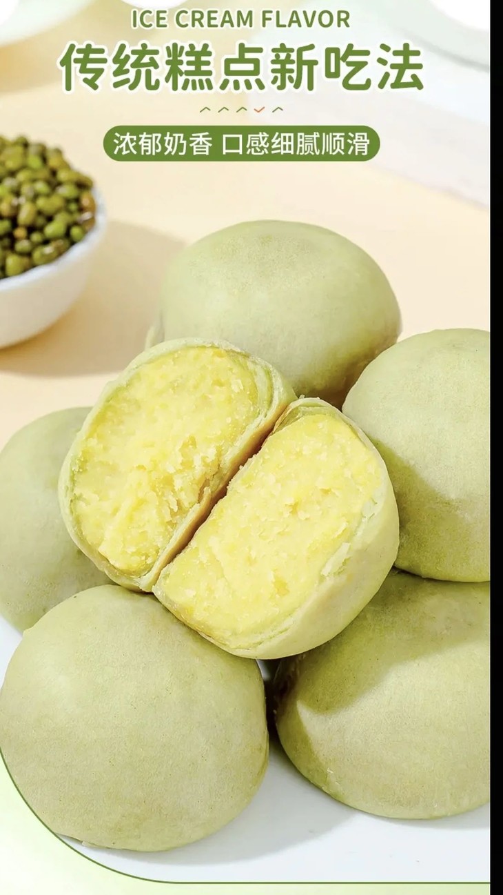吃过冰淇淋口感的饼没?这个口感太神奇了它是软皮的,皮很薄口感糯糯的有种入口即化的感觉带绿豆清香的冰淇淋味🤭饼控的姐妹们一定要尝,口感太惊艳了快点去尝,用文字形容不出来它的好吃