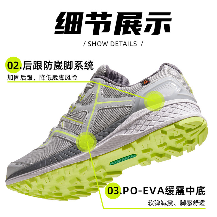 再来说说它的【后跟防崴脚系统】。加固设计有效降低崴脚风险,尤其是在复杂地形中,这个小细节可是救了不少“崴脚星人”的命!同时,它还搭载了P0-EVA缓震中底,软弹减震,每一步都像踩在云朵上那么舒适。
