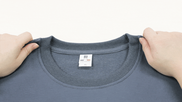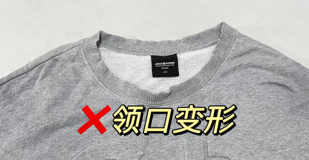 市面上一些“纯棉”卫衣,领口因为穿、脱、拉伸,很容易变形,穿久了领口就会“拉垮”