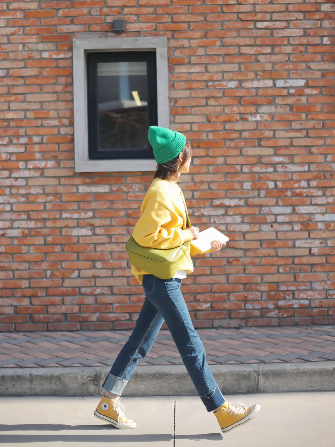 搭配高腰牛仔短裤和帆布鞋,外加一个黄色斜挎包,整体风格甜美活力,适合春日出游或约会。