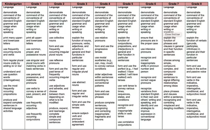 再次,3️⃣ 在英语母语国家学校,都会系统教授语法,美国通用课标CSSS(Common Core Standards of States)对美国各州从幼儿园kindergarten到小学每个学年需要掌握的语法知识都有非常细致的要求;
