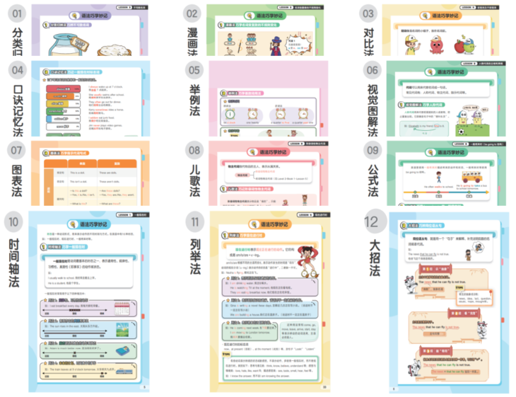 这一套语法课程经过新东方特级教师教研团队30余载经验沉淀迭代优化,总结出12种语法好方法:视觉化、对比法、儿歌法、分类归纳法、公式法、举例法、口诀法、列举法、漫画法、时间轴法、视觉图解法、图表法,视觉化工具➕朗朗上口的妙记口诀,把繁杂的语法简单化,学生轻松理解,容易坚持学。