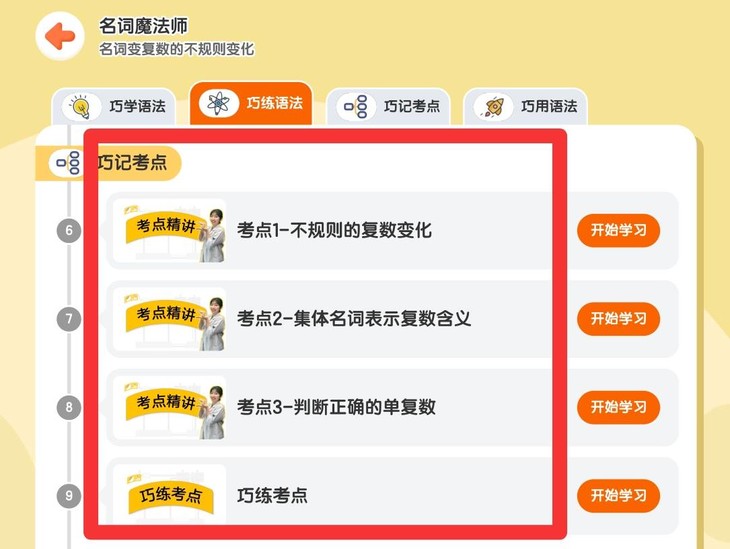 首先【巧学语法】模块就是前面说到的新东方专业老师用12种巧学方法趣味讲解语法,让孩子愿意学、听得懂、记得住。