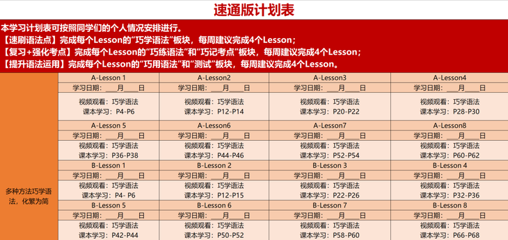 按照这套官方学习计划表,以每周一讲的进度学习,96周(约2年时间)可以学完整个小初高语法内容,构建起完善的英语语法知识体系~
