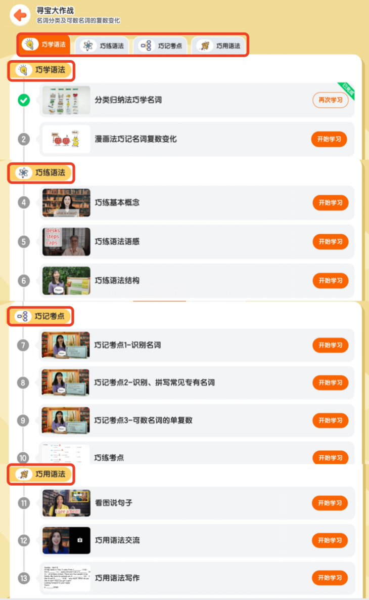 比如如果孩子当下的学习重点是应试提升,我们就可以选择【巧学语法】➕【巧记考点】两个环节进行学习,然后完成课本上对应的练习。
